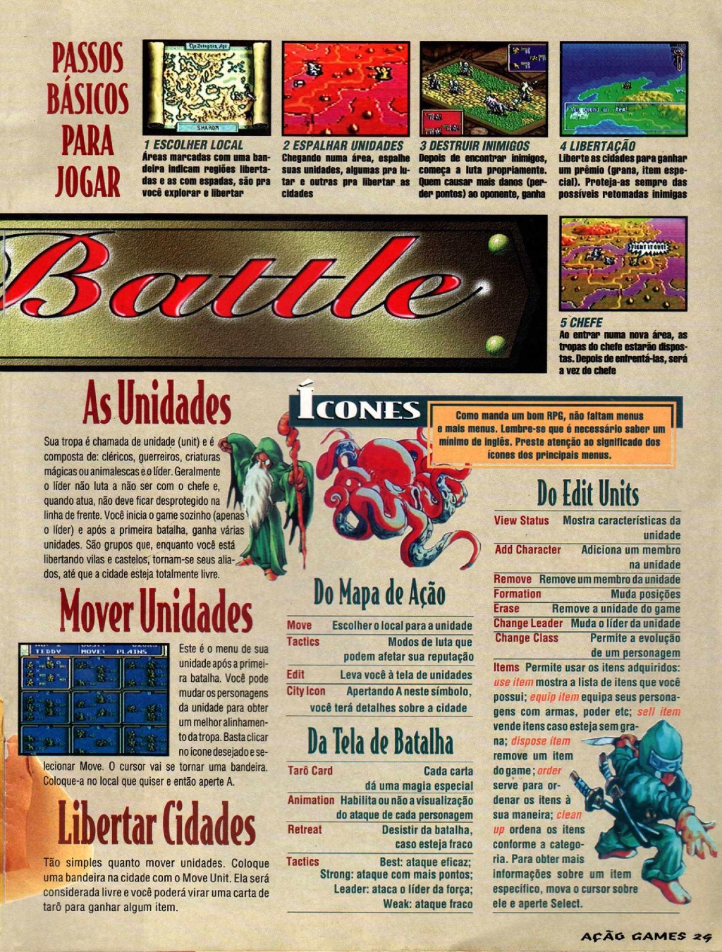Em primeiro lugar é necessário observar que hoje eu não sou a mesma pessoa que era vinte anos atrás (uau, temos um Xerox Rolmes aqui heim). Na época eu sequer imaginava o que diabos seria um RPG Tático, hoje é um dos meus generos favoritos. O que eu sabia, no entanto, é que Ogre Battle recebeu uma matéria de três páginas na Ação Games com ilustrações japonesas muito bonitas e era um jogo que eu queria conhecer. O que nos leva de volta a questão inicial: e aí, o balconista da Video Room II de 25 anos atrás estava certo.