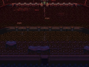 Locke, Kupo, Relm, Strago, Terra e Umaro de FINAL FANTASY 6assistindo no coliseu, bem direto no kokoro
