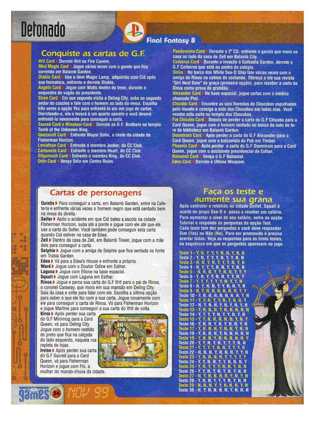 A outra coisa que tem que ser elogiada nesse jogo, e não é pouco, é que ele tem o melhor jogo de cartas da história dos videogames - apenas Gwent pode rivalizar com o Triple Triad, e honestamente a Squaresoft não precisava ter ido tão hard para fazer um minigame tão bom. Com efeito, se só esse minigame fosse lançado standalone ganhava um "The Best Of" fácil.